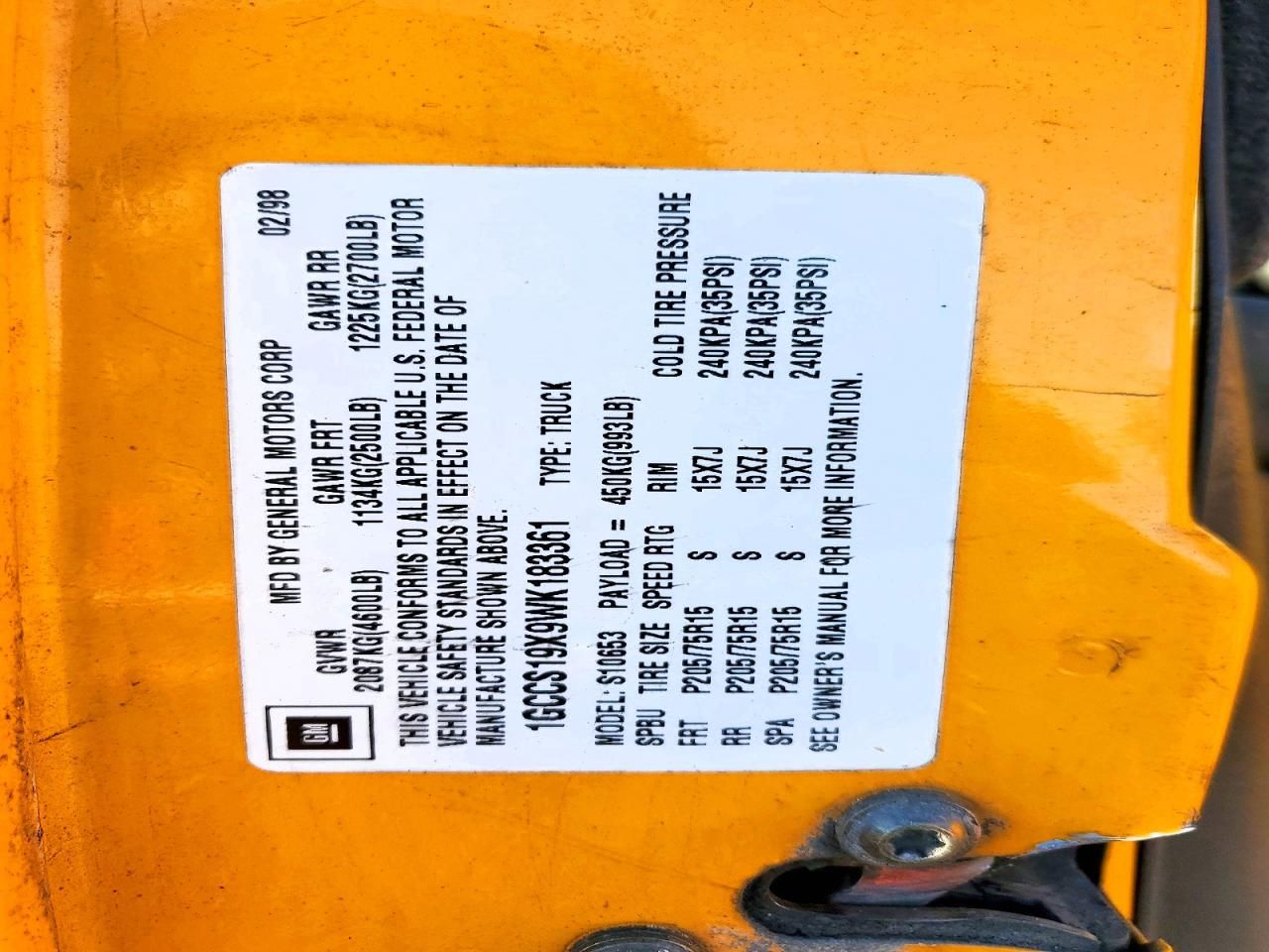 1998 CHEVROLET S TRUCK S1